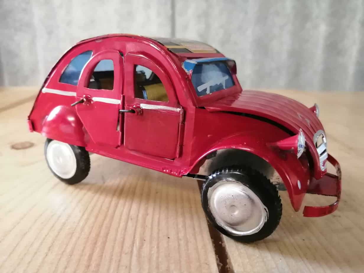 The crafts people I work with in Madagascar produce lovely models of these charismatic cars and I am proud to sell them on this site. Each one is crafted from recycled materials by tinsmiths in the villages around the Madagascan capital Antananarivo. The parts are cut without use of a template before being soldered together, making each car completely unique. For this reason I have photographed each separately and put them on as individual listings.